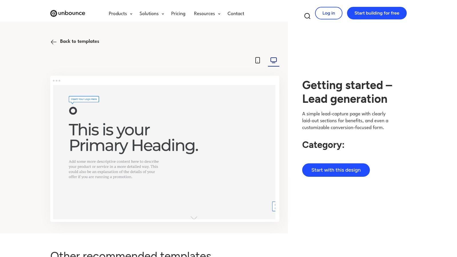 - Vast Template Library: Unbounce offers over 100 landing page templates tailored to specific industries and goals, such as SaaS demos, ebook downloads, and webinar registrations. These templates provide excellent lead generation form examples already optimized for conversions.