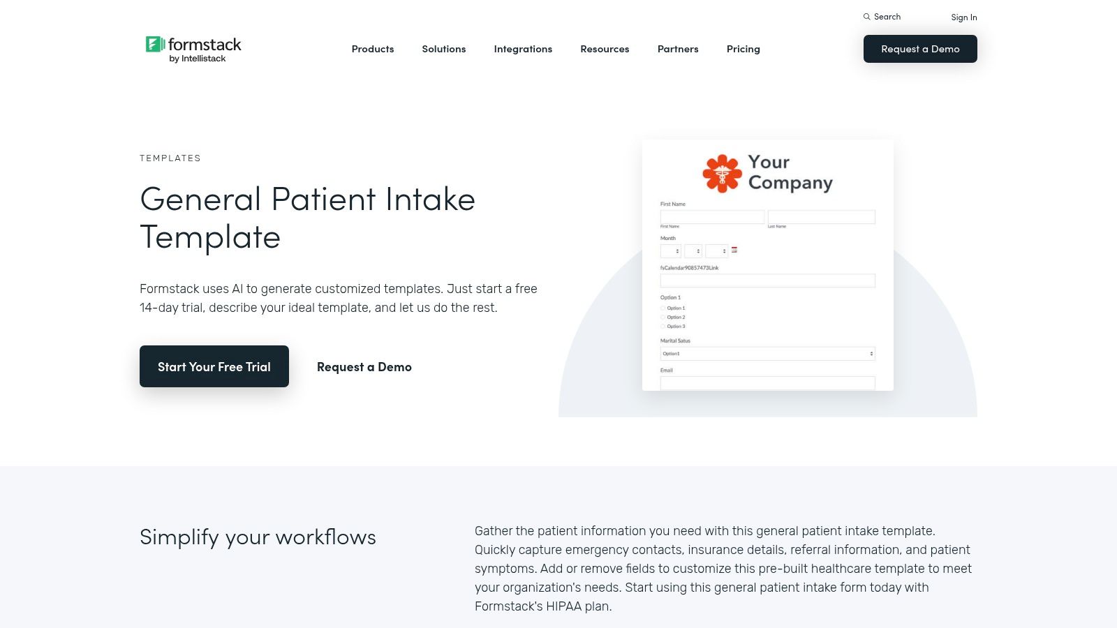 Formstack is an enterprise-level platform specializing in secure data collection and workflow automation, making it a top choice for regulated industries. It provides a robust collection of intake form templates designed for complex processes like patient registration, client onboarding, and social work assessments. The platform's main differentiator is its focus on end-to-end workflow automation, moving beyond simple data capture to include document generation, e-signatures, and automated approvals.